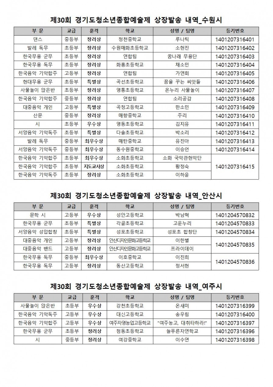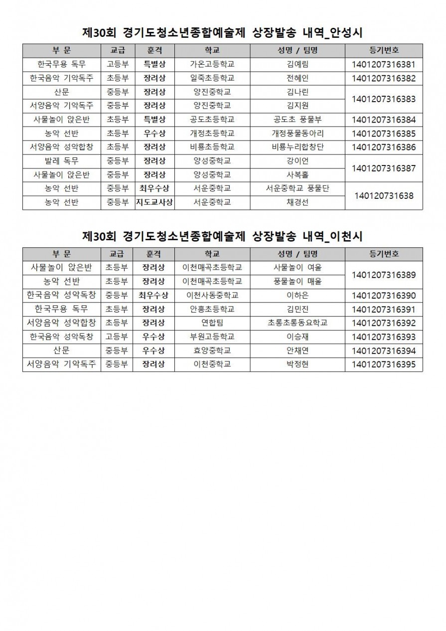 제30회 경기도청소년종합예술제 상장발송내역입니다.